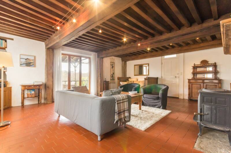 Curl up with a book by the fire and enjoy the warmth of the Jotul wood-burning stove in the granite fireplace. This large living room, typical of the Morvan region, has old terracotta floor tiles and a French-style ceiling.