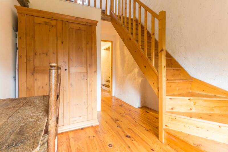 You'll sleep like royalty in this large bedroom with its king-size bed, cathedral ceiling, exposed stone walls and wooden floor.